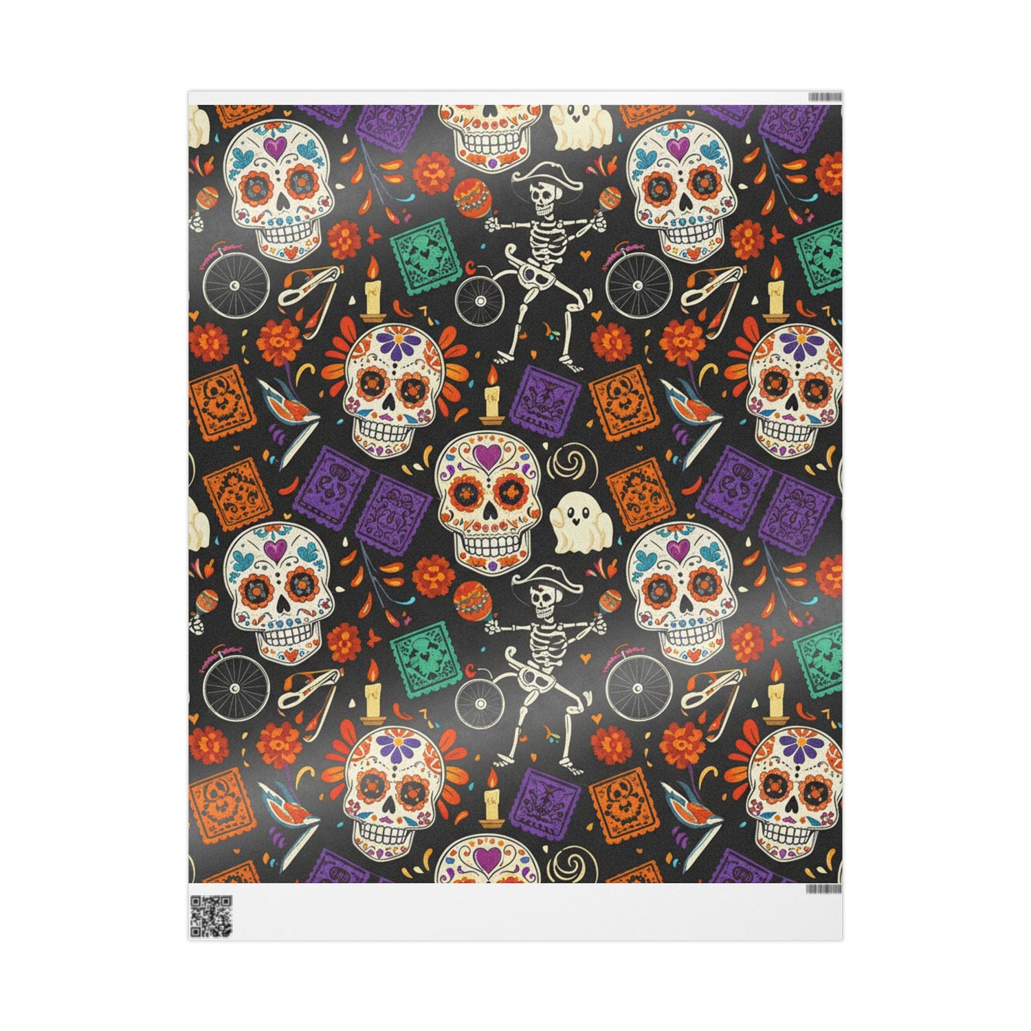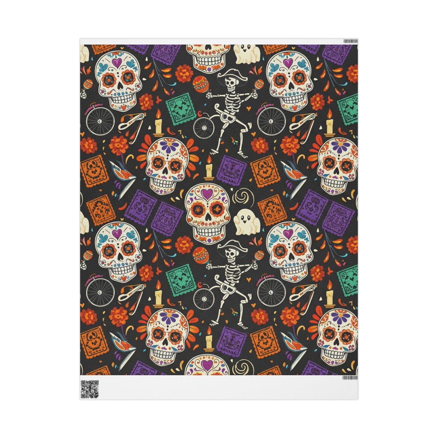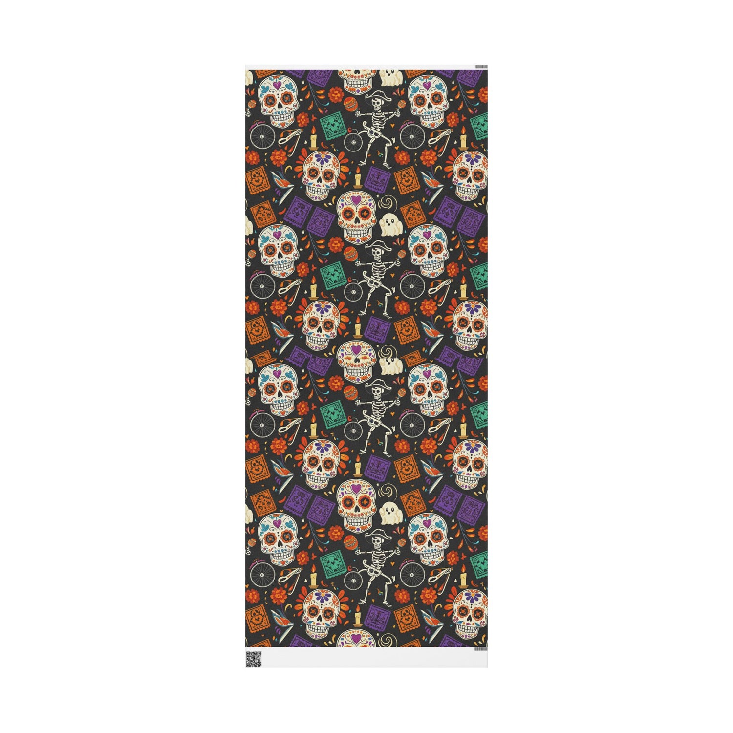 Bring vibrant Día de los Muertos energy to your gift-giving with this illustrated wrapping paper. A lively pattern of sugar skulls, skeleton dancers, marigolds and papel picado motifs dances across a deep, inky background — bold colors and playful details that make each parcel feel like a small celebration. The print feels handcrafted, full of warmth and ritual, and the heavy paper holds folds and ties beautifully. Use it to wrap a candle, a book, or a special piece of jewelry and watch the recipient’s face light up when they see the lively design.